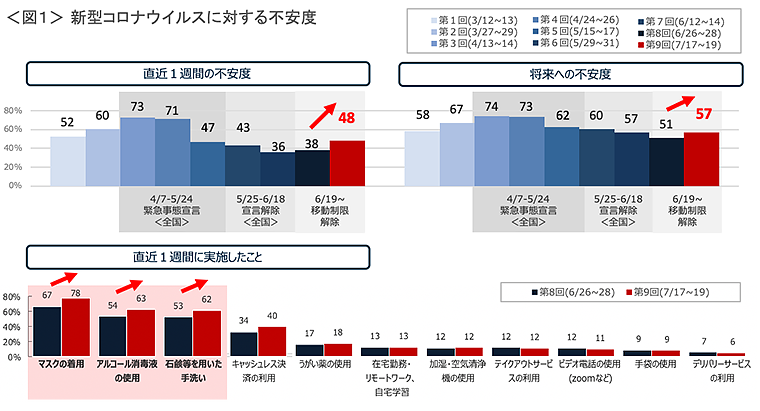 【新型コロナウイルスに対する不安度】 定点指標としてきた「直近1週間の不安度」および「将来への不安度」の推移について、前回調査時点から今回大きく上昇に転じ、第1回目調査の3月中旬の水準にまで再び達した。緊急事態宣言の解除後、不安度は減少傾向にあったものの、連日の感染者数の増加に伴い再び緊張感が高まっていることが窺える。 その影響もあり、【直近1週間に実施したこと】として、「マスクの着用/アルコール消毒の使用/石鹸等を用いた手洗い」などの感染予防の実施率が大きく上昇した。<図1>