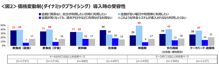 【価格変動制(ダイナミックプライシング)の受容性】 「密」を避ける対策として注目されている「価格変動制(ダイナミックプライシング)」の受容性について業界別に聴取した。 価格変動制が導入された場合、 【飲食店・新幹線】では「金額の安い時間帯に利用」と「金額に関係なく自分の利用したい日時に利用」の両方が高いことから、“ピーク時間の分散”が期待される。また「映画館・文化施設・テーマパーク」など【レジャー関連施設】は「金額の安い曜日や時間帯」での利用意向がより高く、新たな利用機会やユーザー創出が期待される。“便利さ”を重視したいのか、“お得感”を重視したいかで、業界それぞれニーズが分かれそうな見込みだ。<図2>