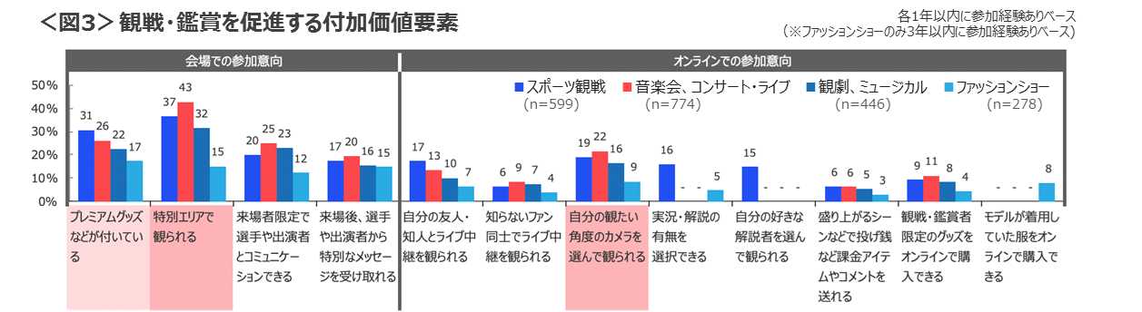 【観戦・鑑賞を促進する付加価値要素】 新型コロナの影響を大きく受けるエンタメ業界において、利用促進の一助となりそうな付加価値要素を聴取した。スポーツ観戦・音楽ライブ・観劇では、会場なら「特別なエリアで観られる」こと、オンラインなら「観たい角度のカメラを選んで観られる」ことで参加意向が高く、利用促進の可能性がうかがえる。またスポーツ観戦・ファションショーでは「プレミアムグッズがついている」ことで、会場での参加意向が高い結果となった。<図3>