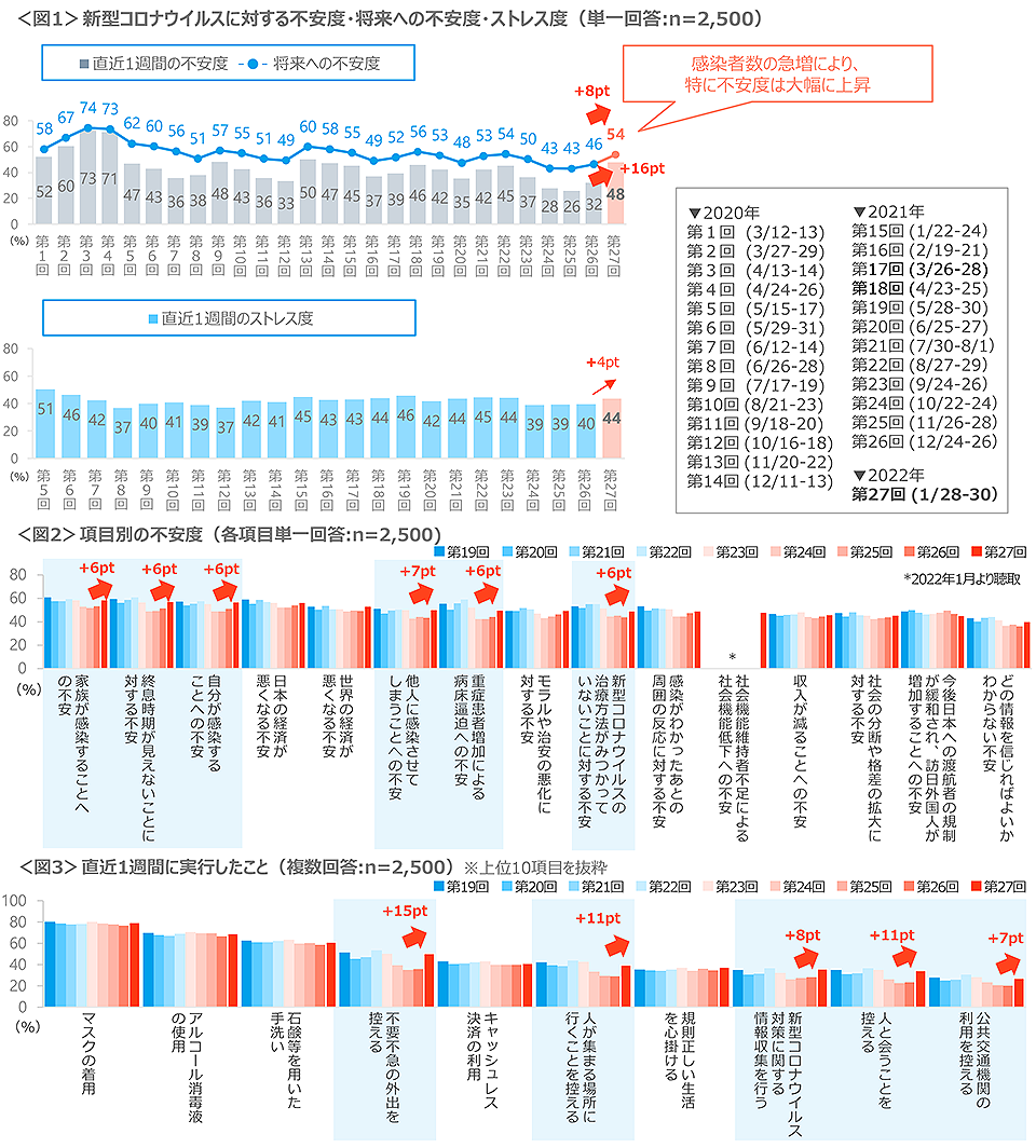 新型コロナウイルスが消費者の行動や意識に与える影響の把握を目的として、全国47都道府県に在住する20〜69歳の男女2,500人を対象に「新型コロナウイルス生活影響度調査」を第1回(2020年3月12日〜13日)から定期的に実施。2022年1月の第27回は、全国の新規感染者数がうなぎのぼりに増え、8万人を超えた1月28日〜30日に調査を行い、人々の意識・行動について分析しました。