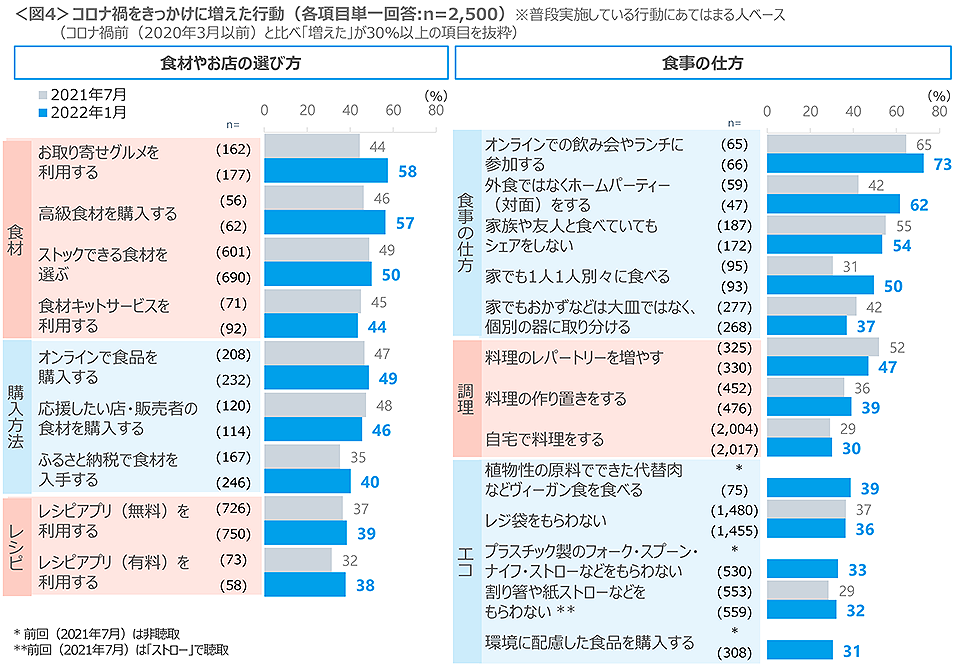 普段実施している行動を聴取し、コロナ禍前(2020年3月以前)との増減を確認した。コロナ禍により増えた行動は、“食材やお店の選び方”では、「お取り寄せグルメの利用」「高級食材を購入」「ストックできる食材を選ぶ」が高い。半年前の調査結果と比べると「高級食材」や「お取り寄せグルメ」の上昇が目立つ。一方、“食事の仕方”では、「オンラインでの飲み会やランチに参加」「外食ではなくホームパーティをする」「家族や友人と食べていてもシェアをしない」など感染予防対策関連の行動が高い。オミクロン株は家庭内感染者が多いことから「家でも1人1人別々に食べる」割合が高まっていた。<図4>