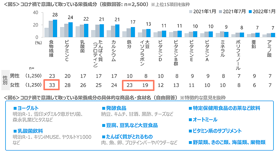 コロナ禍で意識して取っている栄養成分は「食物繊維」「ビタミンC」「乳酸菌」「たんぱく質」「カルシウム」がTOP5で免疫力関連の栄養成分が多くあがった。加えて女性は「鉄分」「大豆イソフラボン」の割合も高い。1年前と比べると「食物繊維」「ビタミンC」「たんぱく質」「カルシウム」などは大きく増えた。<図5>