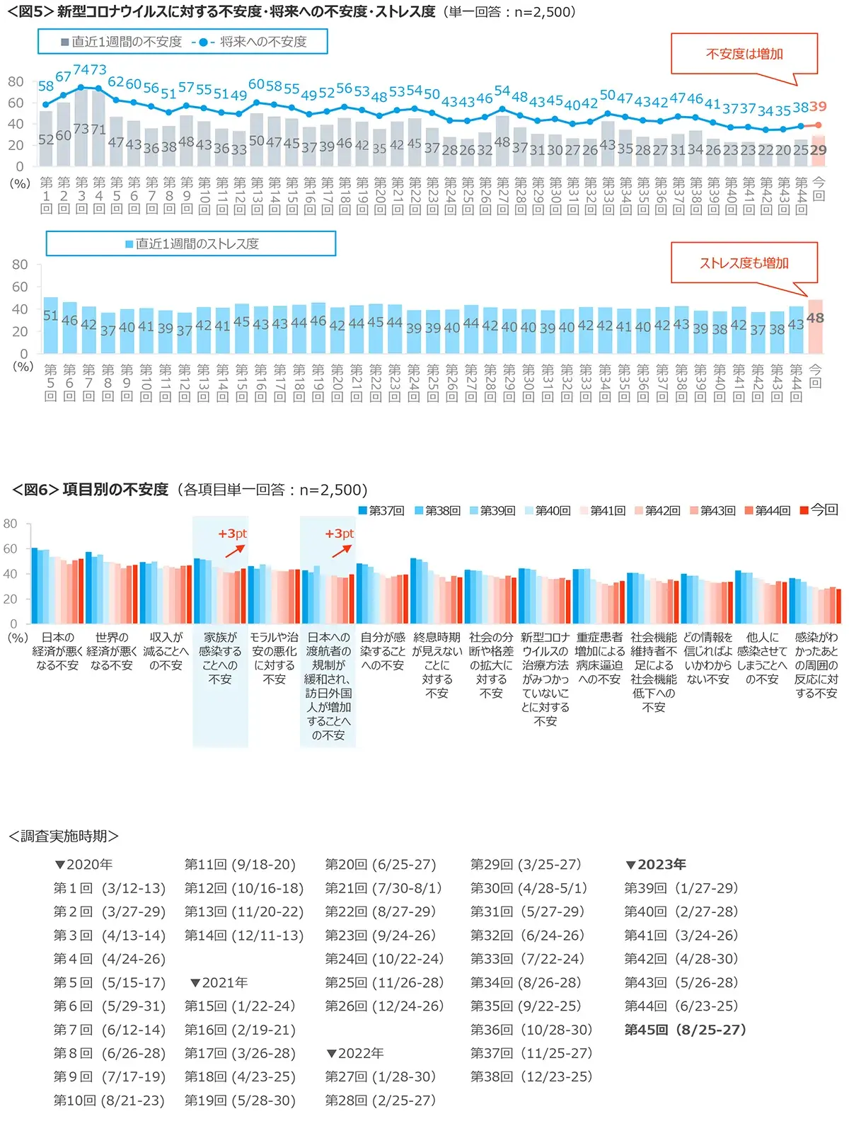 定点指標の「直近1週間の不安度」は4pt増の29%、「将来に対する不安度」は微増の39%。猛暑日が多かったこともあり「直近1週間のストレス度」は6pt増の48%であり、不安度、ストレス度ともに増加に転じた。<図5>