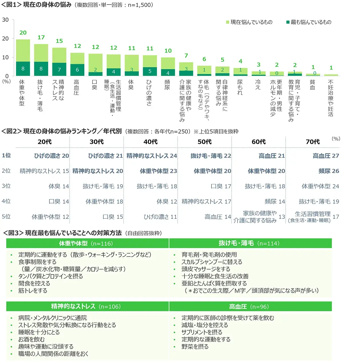 図1 現在の身体の悩み、図2 現在の身体の悩みランキング/年代別、図3 現在最も悩んでいることへの対策方法