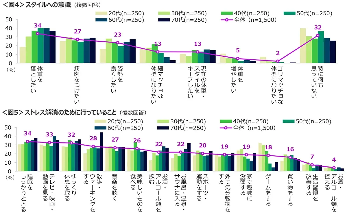 図4 スタイルへの意識、図5 ストレス解消のために行っていること