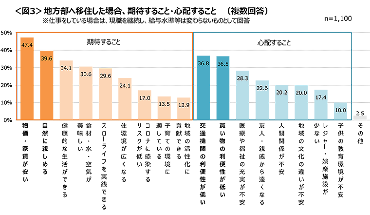郊外や地方に移住することになった場合に期待することは「物価・家賃が安い」が半数弱で最も多く、生活費の負担が軽減されることへの期待が大きい。そのほか「自然に親しめる」も4割弱で多い。一方で、移住により心配することは「交通機関の利便性が低い」と「買い物の利便性が低い」が最も多く4割弱となった。<図3>