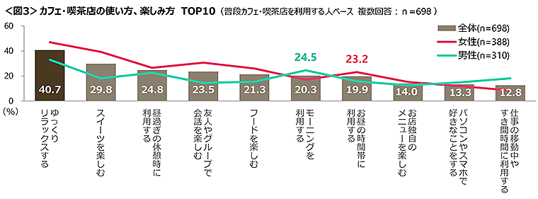 男性は「モーニングを利用する」が24.5%と女性より高く、対して女性は「お昼の時間帯に利用する」が男性より高くなる結果となった。<図3>