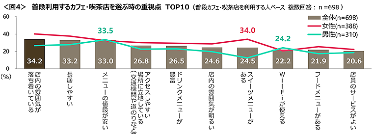 男性は「メニューの値段が安い」「Wi-Fiが使える」、女性は「スイーツメニューがある」のもポイント。<図4>