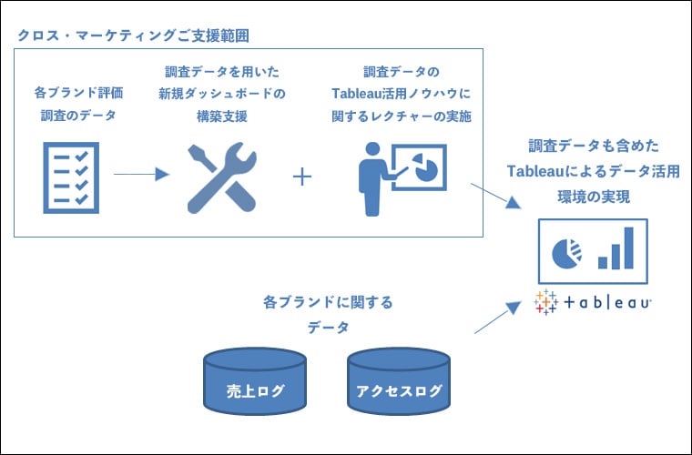 本件において私たちが提供したソリューションのひとつが、マーケティングリサーチ会社としてさまざまなアンケートデータのBI活用の支援で培ってきた経験に基づいたナレッジの提供でした。一癖あるアンケートデータをTableau上で正しく活用するためのレクチャーを、社内メンバー向けに講義形式で実施。過去の調査データをベースとした新規ダッシュボードの構築支援も並行して実施するなど、知識と環境の両側面からアンケートデータのTableau活用に向けた支援を提供しました。