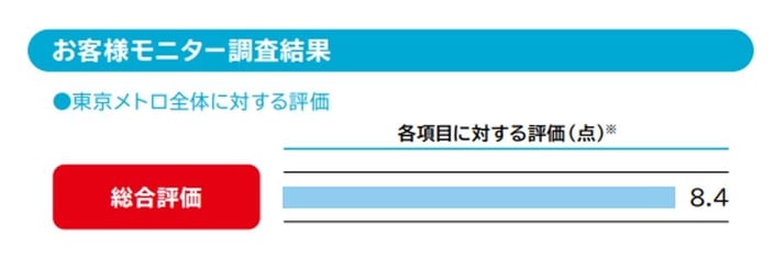 - 2023年度のモニター調査では、東京メトロ全体に対する評価で10点満点中8.4点の評価を獲得