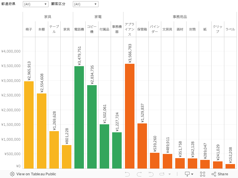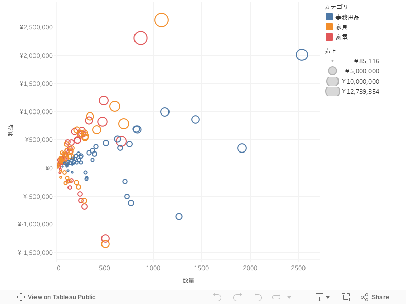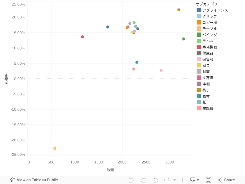 例えばここで、事務用品は売上がやや小粒だが、多売により利益を挙げられているとわかる。