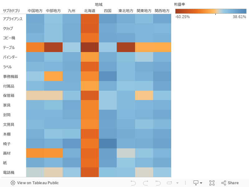 ヒートマップは、色の濃淡や色相を使用してデータのパターンや変動を視覚化します。色の変化により、大量のデータでも関係性、パターン、異常値を素早く把握することができます。たとえば、一定期間にわたる時間帯別のWebサイト訪問者数をヒートマップで表示すると、訪問者数が多い日や時間帯を一目で確認することが可能です。▲サブカテゴリーと地域のマトリックスに、利益率で色付けしたサンプルヒートマップ。
