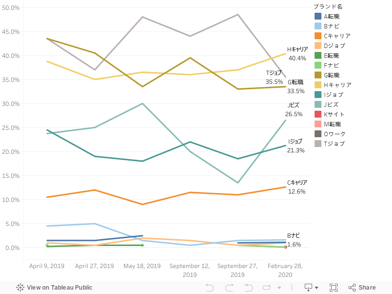 折れ線グラフは、時間の経過と共に数値がどのように変化するかを視覚化するのに適しています。たとえば、年間の気温の変化や会社の売上高の月次トレンドを示す際などに使われます。▲転職サイトの想起率調査結果を時系列で表したサンプルグラフ。