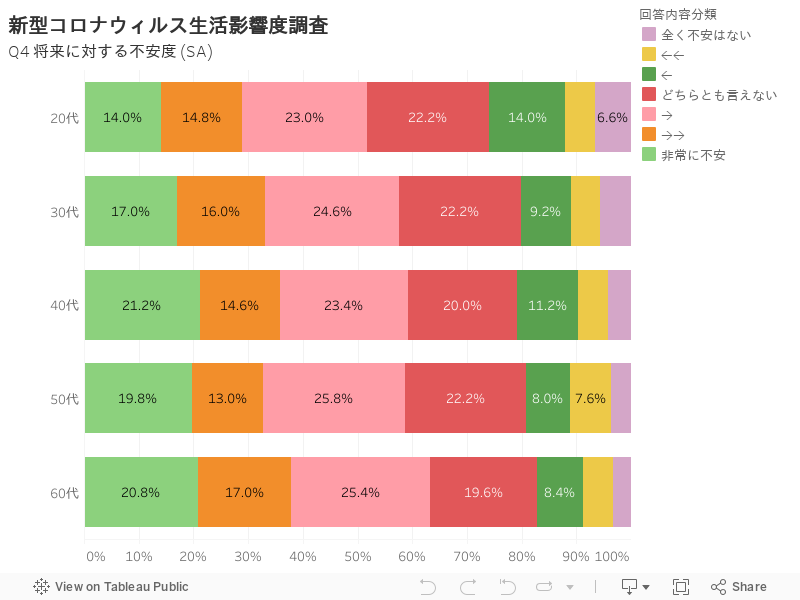 帯グラフは、各項目の比率を視覚的に表示するのに適しています。帯グラフを縦に複数並べることで、構成比の変化を把握したりセグメントごとでの比較が容易になります。▲2020年3月12日実施の新型コロナウィルス生活影響度調査(弊社実施)における将来の不安度を年代別に帯グラフで示したもの。年代ごとに不安度が高まるのがわかる。