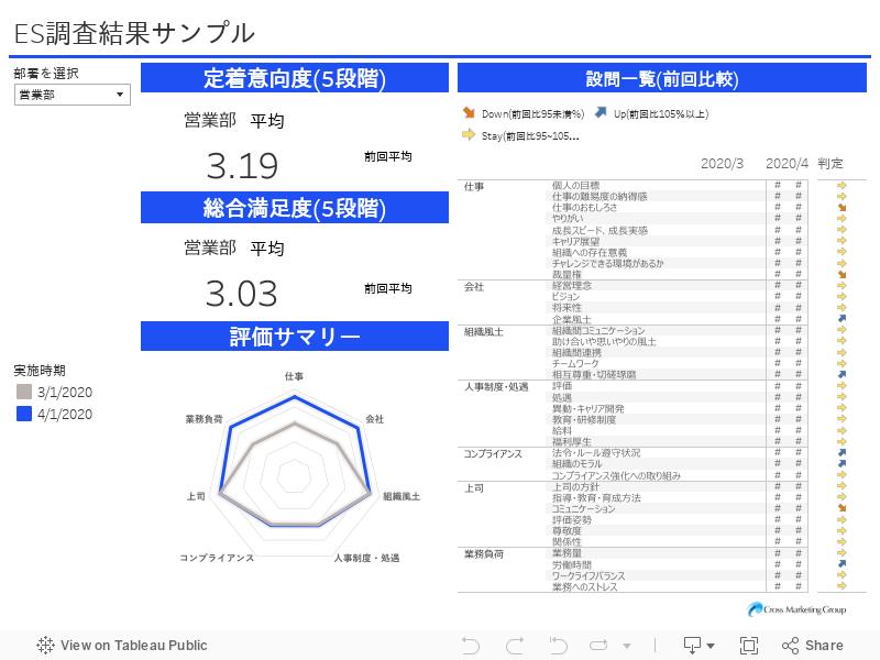 レーダーチャートは、対象の持つ複数の構成要素をまとめて比較する目的で使用されます。各軸が一つの要素を表し、。値は中心を0として軸上にプロットされ、線で結ばれます。構成比やバランスから対象の持つ特性を見出すことができ、2つ以上重ね合わせることで比較も可能です。商品やサービスの様々な特性の比較、あるいは個々のパフォーマンスの多面的な評価などに活用されます。▲ES調査結果をBIツールTableauにてダッシュボードとして視覚化したサンプル。