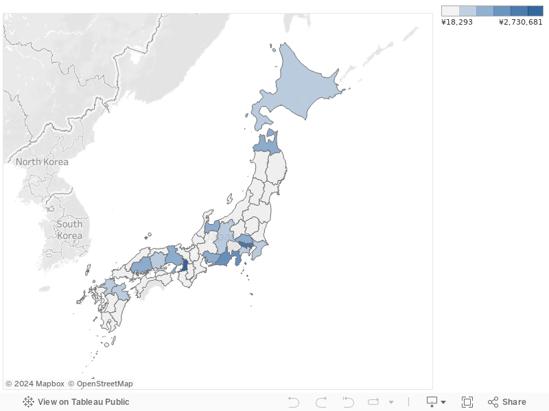 色が濃くなるほど、売上が高い都道府県にあたる。都心部で特に売り上げ状況が良いことがわかる。