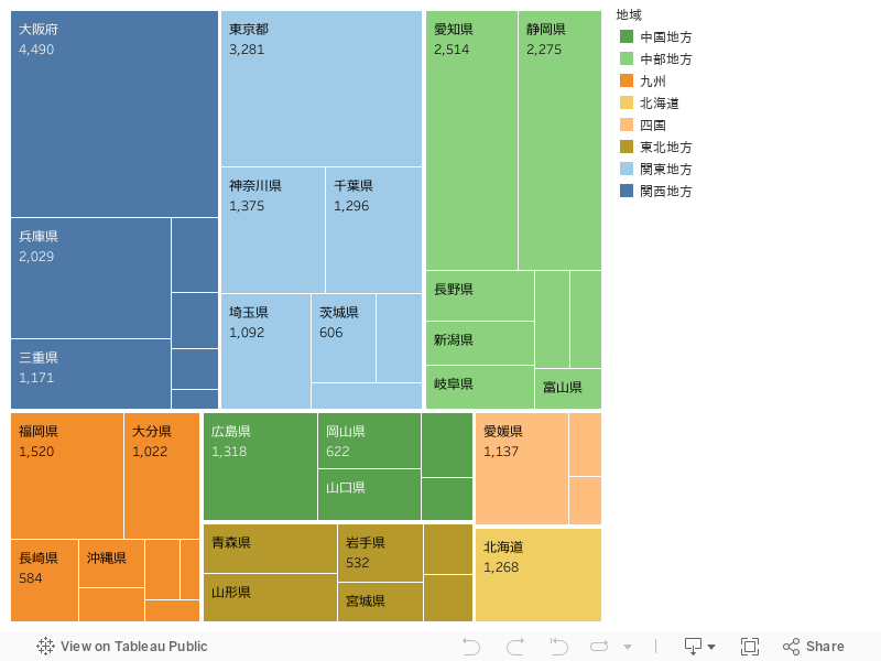 ここでは地域別での色分けを行っているため、地域単位での比較も含めて直感的な理解が進む。
