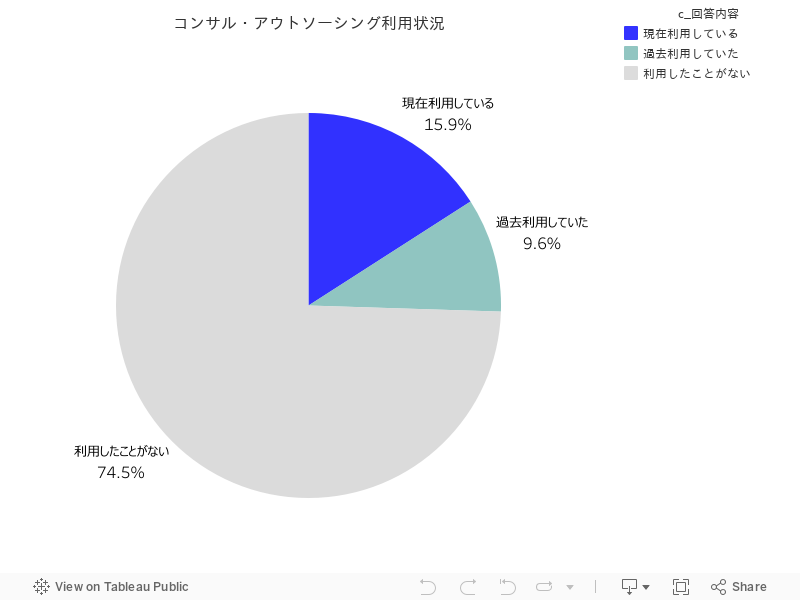 円グラフは、全体に対する各部分の割合を示すのに適しています。円全体が全体の100%を表し、各スライスが特定の部分の割合を示します。たとえば、市場シェアや人口の年齢構成などを視覚化する際によく使われます。▲営業向け社内調査におけるアウトソーシング利用状況を円グラフで表したサンプルグラフ。