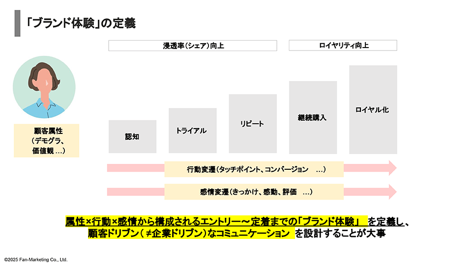 そうなりますと、私たちが提供している「ブランド体験」の定義が重要になります。それは「属性」「行動」「感情」の3要素から構成される、エントリーから定着までの体験と定義しています。セグメンテーションによって「属性」を把握でき、データによって「行動」も追跡できますが、重要なのは「体験」そのものです。「行動」の中で顧客がどのような感情の変遷を辿ったか、どのような感動や評価があったか、といった「感情」の部分を理解することです。