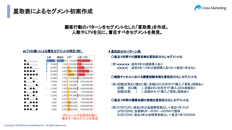 有効な顧客のセグメントを作るために、RFMの視点を応用した星取表という手法を使っています。星取表では、ある期間ごとに購買が発生したか否かでセグメントを作成し、その顧客セグメント別に人数構成やLTVを確認することができます。お客様の業態に合わせて、例えばオムニチャネルで販売している場合は星取表の観点に店舗利用やEC利用といったチャネルの区分を追加したり、1年ごとに購入金額が上がったか下がったかでセグメントを作成したりします。