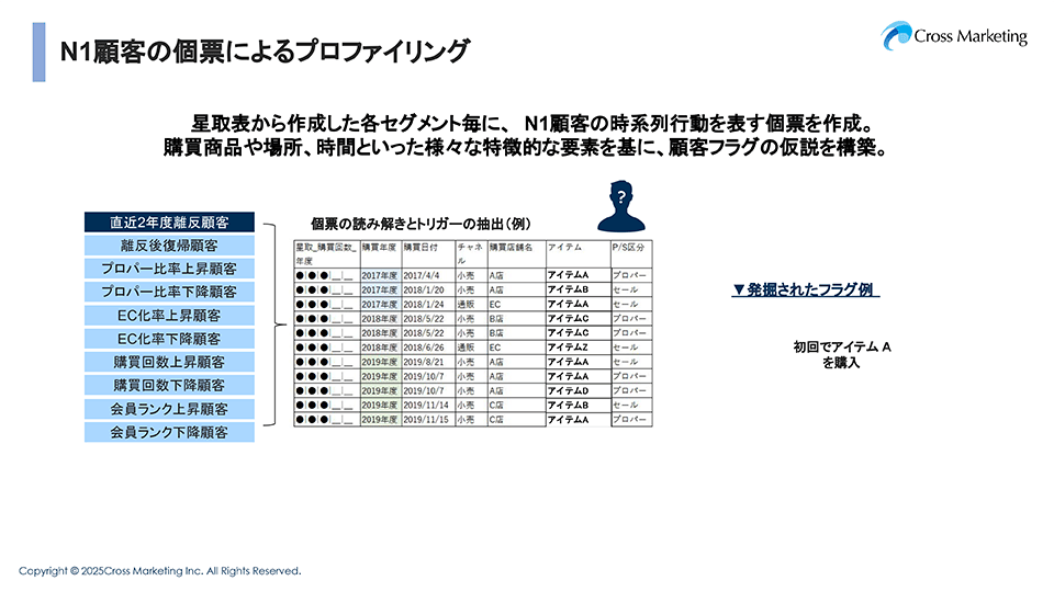 弊社のセグメンテーション手法の特徴は、「N1顧客の具体的行動からの発想」に基づいている点です。まずセグメントを作成し、そのセグメント内にいる顧客一人ひとりの具体的な行動を時系列で見ていくことで、「このような行動をしている顧客は優良顧客なのではないか」といった仮説を構築していきます。