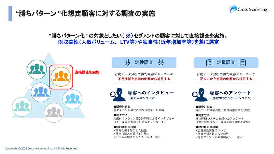 次に行うのが、顧客に対するリサーチです。行動データだけではブランド体験の解像度が粗くなりがちですので、行動の前にあるきっかけや、行動の後に得られた評価や感動を明らかにするために、調査を実施します。独自セグメントの顧客に対してデプスインタビューをすることで深掘りを行い、さらにWebアンケート調査などで仮説の検証や定量的な裏付けを取ることで、リアルな顧客体験を定義していきます。