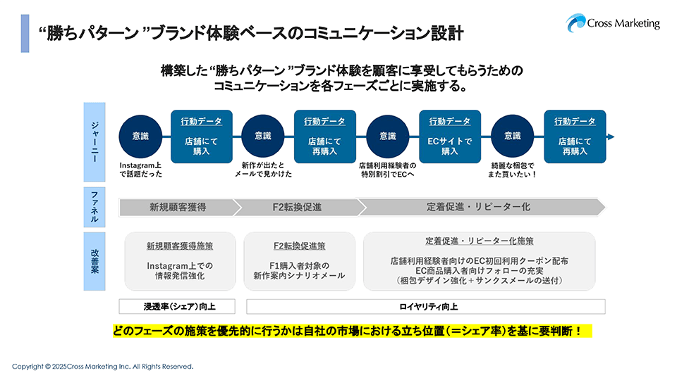 2つ目は、そのジャーニーの中で、どのフェーズに注力すべきかを、市場における自社の立ち位置なども考慮した上で見極め、コミュニケーション戦略を考えましょう、ということです。