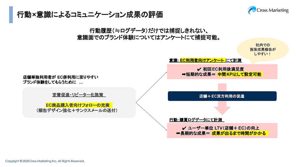 ここでも、私たちの特徴である「行動×意識」で捉える視点が重要になります。コミュニケーションの成果を測る上でも、「意識」データが鍵となるということです。顧客の満足度や認識の変化などをアンケートで測定し、それを中間KPIとして設定することで、施策の短期的な効果を捉えることが可能になります。この中間KPIを設定することで、たとえLTVのような長期的な指標がまだ向上していなくても、「LTV向上に向けて重要視しているこの中間指標は、狙い通りに推移しています」と社内で共有しやすくなり、施策成果の報告が格段に行いやすくなります。