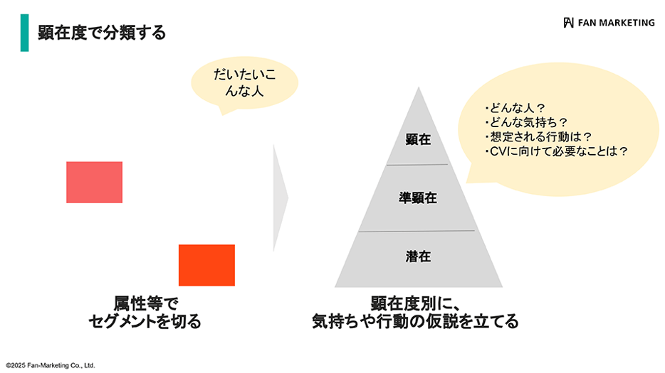 クロス・マーケティング様からは、セグメントを切ってインタビューや調査を行うというお話がありましたが、弊社からは、顧客セグメントを「顕在度」別に分類し、それぞれの心理状態や行動の仮説を立て、そこからコミュニケーションを設計していく手法をご紹介いたします。