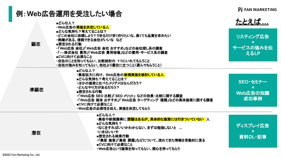そこで、そのセグメントを顕在度で分解し、心理状況や想定される行動の仮説を立てていきます。例えば、顕在層は「Web広告の実施を決定している人」、準顕在層は「実施を検討している人」、潜在層は「課題はあるけど具体的な施策には行きついていない人」という具合に分けられます。そして、顕在度ごとに、それらの人がどのような気持ちで何を考え、どのような行動をするのかを考えてみます。
