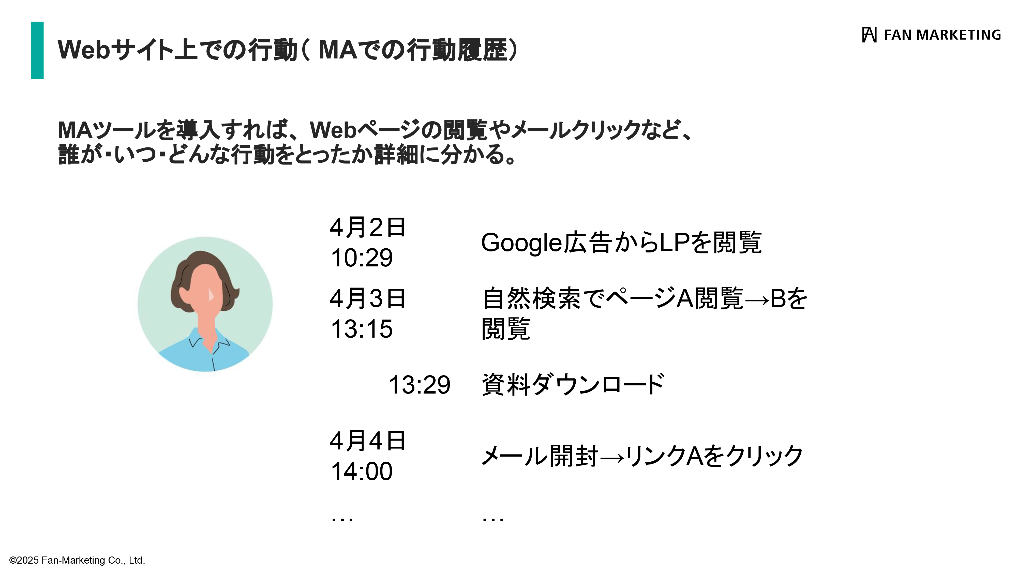 では、こうした仮説をどのように立てるか、という点ですが、クロス・マーケティング様にご紹介いただいたデプスインタビューや購買データ分析に加えて、Webサイト上での行動分析も有効です。MA(マーケティングオートメーション)ツールを導入していれば、Webサイト上での個々のユーザー行動が把握できるため、それらのデータから仮説を立てたり、既存の仮説の妥当性を検証したりすることも可能です。