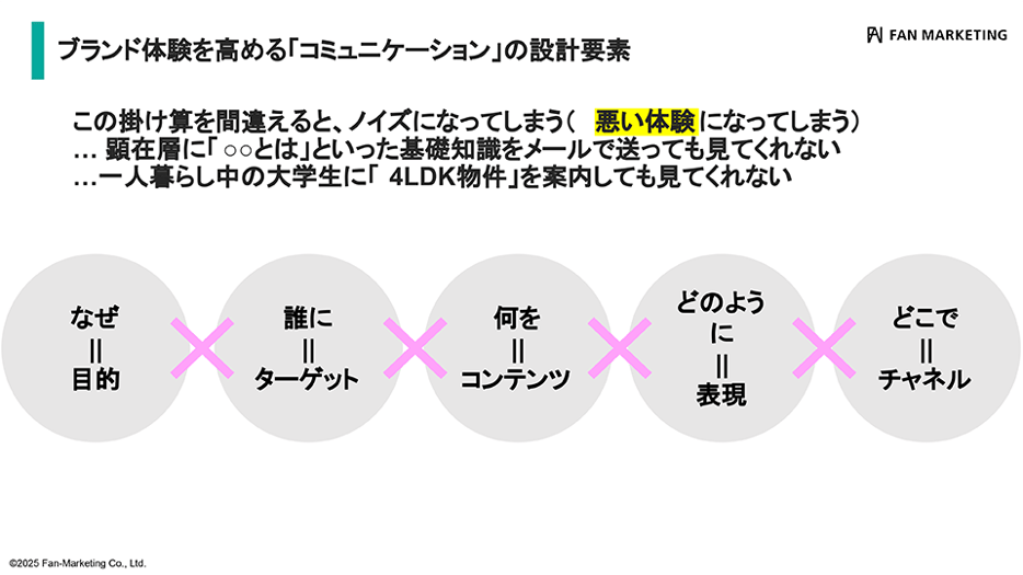 実行においては、目的・ターゲット・コンテンツ・表現・チャネルという5つの要素の掛け合わせと一貫性が重要だと考えています。これらの要素間において一貫性を欠くと、コミュニケーションがノイズとなり、かえって悪い体験を与えてしまうことにもなりかねません。(具体的な事例の紹介は個別でさせていただきますので、興味がある方はこちらからお問い合わせください)