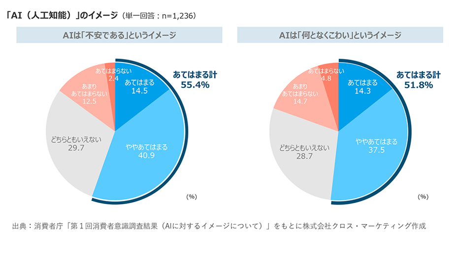 何が起こるのかがわからず、AIについてのネガティブな情報が発信されることも多いため、AIに対してマイナスイメージをもつ方も一定数存在するようです。消費者庁が行った調査(2020年2月)でも、AIに対して「不安である」「何となくこわい」と回答した方が5割近くに上りました。