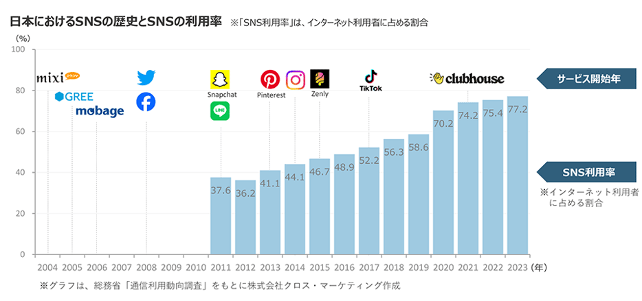 SNSが本格的に普及をはじめたきっかけとなるのは、2004年に登場した「Facebook」と2006年に登場した「Twitter(現:X)」です。