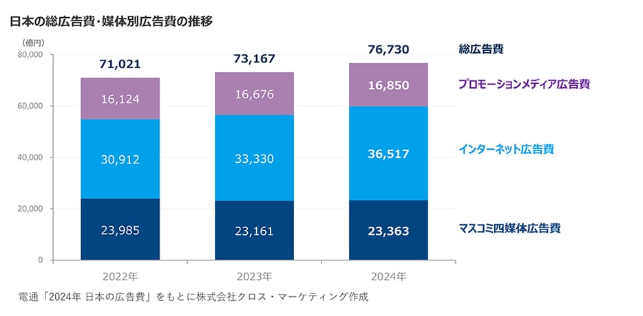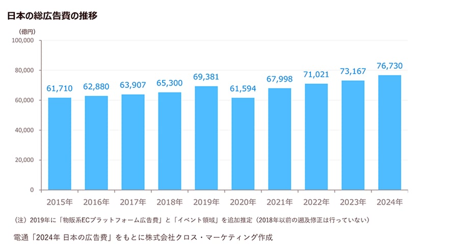日本の広告市場は成長を続けており、2024年の総広告費は7兆6,730億円となりました。この背景には、コロナ禍からの回復やオリンピック・パラリンピックなどの国際的なイベント、インバウンド需要の増加などがあります。