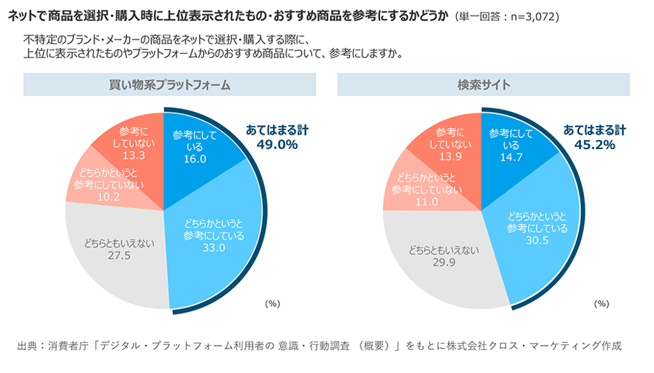 実際に消費者庁の調査によると、消費者の約50%がネットで商品を購入する際に、上位表示される商品やプラットフォームのおすすめを参考にしていると回答しており、パーソナライズド広告が購買行動に影響を与えていることが分かります。