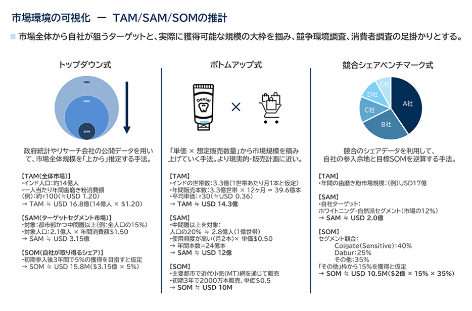 海外市場への参入戦略を検討する際には、市場規模の推計を通じて「どれだけのポテンシャルがあるのか」を定量的に把握することが重要です。特にFMCG製品のような大量消費財においては、TAM(全体市場)、SAM(ターゲット市場)、SOM(獲得可能市場)の3段階で構造的に市場を評価することが有効です。推計には「トップダウン式」「ボトムアップ式」「競合シェア逆算式」の3手法があり、それぞれ統計データ・販売数量・競合情報を起点としています。例えば、インド市場で歯磨き粉を扱う場合、人口や使用頻度、消費金額からTAMを約14億ドルと試算し、ターゲット層を中間層以上に絞ることでSAMを12億ドル、さらに初期3年間でのシェアを5%と見込んでSOMを1,000万ドルと推定することが可能です。