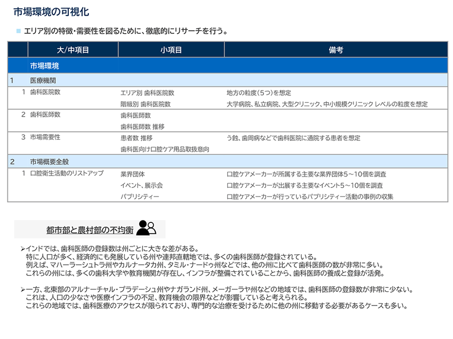 加えて、都市部と農村部の地域格差も見逃せません。例えばインドでは、歯科医の登録数に州ごとの大きな偏りがあり、マハーラーシュトラ州やカルナータカ州に集中している一方で、ビハール州やナガランド州などでは歯科医の数が極めて限られています。このような地域特性を踏まえることで、実需が高いエリアや未開拓市場を的確に見極め、エリア別の優先順位付けやチャネル戦略の最適化が可能になります。参入判断の精度を高めるには、こうした定量・定性の多面的な市場把握が欠かせません。