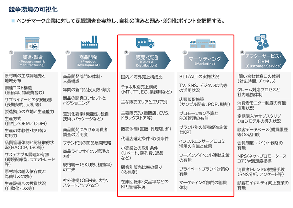 さらに、ベンチマーク企業に対しては、調達・製造、商品開発、販売・流通、マーケティング、CRMといった5つの視点で深掘り調査を行うことが推奨されます。特にFMCG分野では、流通構造の違いやマーケティング施策の巧拙が売上に直結するため、チャネル構成比やプロモーション費用の配分、BLT/ALT(店頭陳列)の実施状況など、現地の商習慣に基づいたきめ細かい観察が必要です。