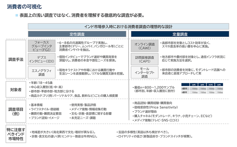 例えばインド市場では、都市部と農村部、北部と南部などで宗教・言語・食文化が異なるため、都市圏ではオンライン調査、農村部では訪問調査など、地域特性に合わせた柔軟な設計が求められます。加えて、定性調査では18~45歳の中高所得層を対象に、パーソナルケア、飲料、食品カテゴリ別の購買意識や価値観を把握します。定量調査では最低800〜1,200サンプルを回収し、年代・都市・収入階層別に分析することで、セグメント別に戦略を描くための基盤が整います。