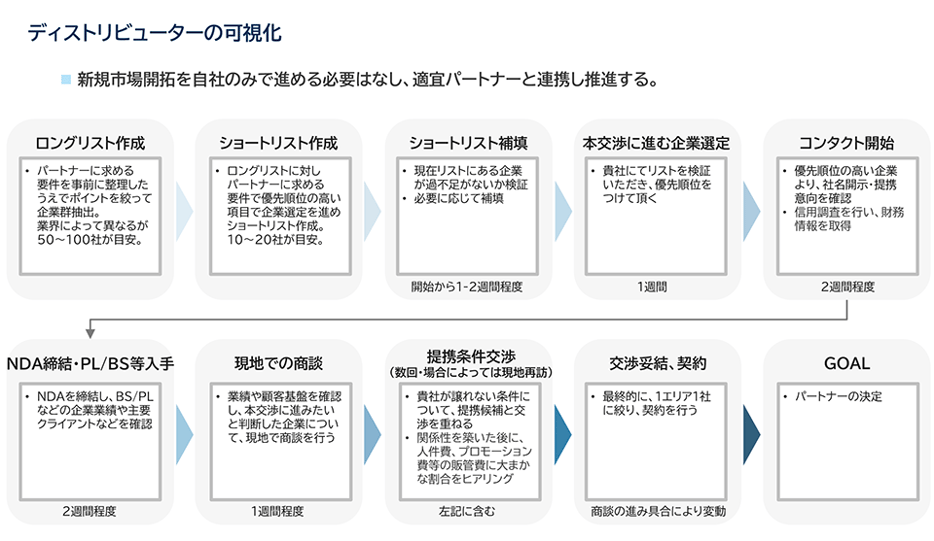 交渉段階では、NDA締結や財務資料(BS/PL)の取得を行い、現地面談にて実務能力やネットワーク、販売体制の実態を確認。条件交渉では、価格・人件費・プロモーション費用の分担などを明確化したうえで、最終的に1社に絞り契約締結となります。