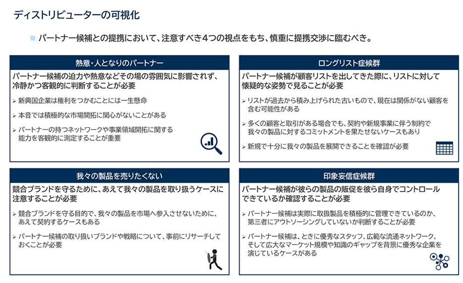 ただし、提携候補の評価には注意が必要です。たとえば「熱意があるが実行力に欠けるパートナー」「既存顧客に縛られ新規展開が難しい企業(ロングリスト症候群)」「競合製品との兼ね合いから自社製品の扱いを避ける意向がある企業」など、パートナー選びには見えないリスクが潜んでいます。また、取扱権限をコントロールできているかを見極める「印象妄信症候群」の回避も大切です。