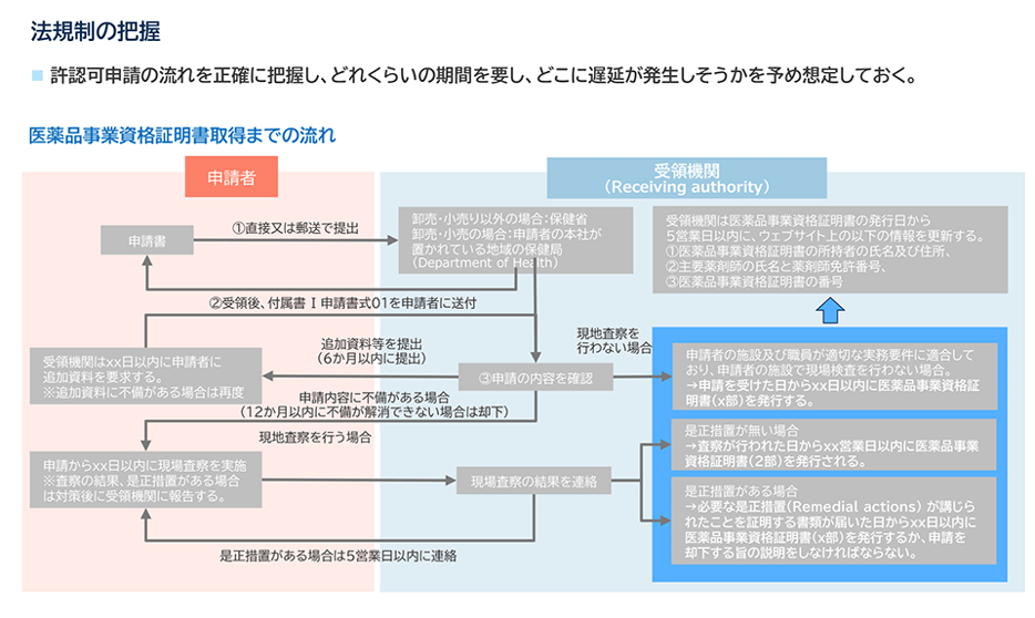 さらに、現地法人の設立形態(単独出資か合弁か)によっても必要な手続きが異なり、各スキームに応じて事前に確認すべき法的・税務的ポイントがあります。加えて、医薬品資格証明書などの許可申請プロセスは、複数の提出書類や現地調査を伴うため、事前に審査期間や追加対応が必要となる箇所を把握しておくことが不可欠です。規制対応は単なる事務手続きではなく、進出戦略の根幹に関わる要素といえるでしょう。