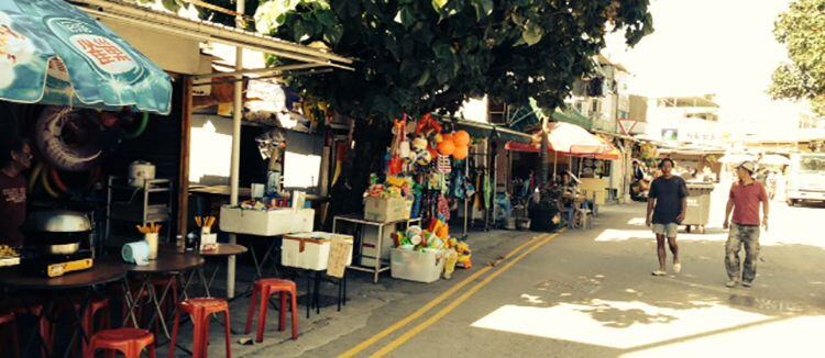 何を言われているのか、わからなかったのですがどうやらビーチパラソルをセットしてくれるということです。バス停周辺には、ビーチで遊ぶグッズを売っていたり、レストランがあったりするなど海辺の街の風景です。
