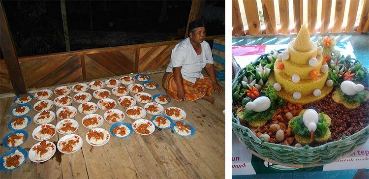左:スラマタンで集まった人のために準備した食べ物、右:インドネシアの伝統料理Tumpeng
