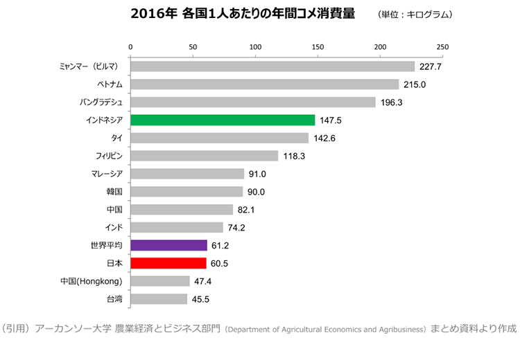 前述通り、インドネシアの人はコメのことが大好きで、たくさん食べています。インドネシアの一人当たりの年間コメ消費量は約148キログラムと多く、日本人1人あたりの年間消費量(60.5kg)の約2.5倍になります。