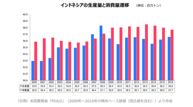 近年のコメの大量輸入は、食糧調達公社(BULOG)の在庫水準(150万トン程度)を適切に維持するためのものになり、現在のコメ生産の成長率は人口増加率を上回って推移しているので、この傾向が続けば今後コメの輸入は減少傾向となっていくでしょう。