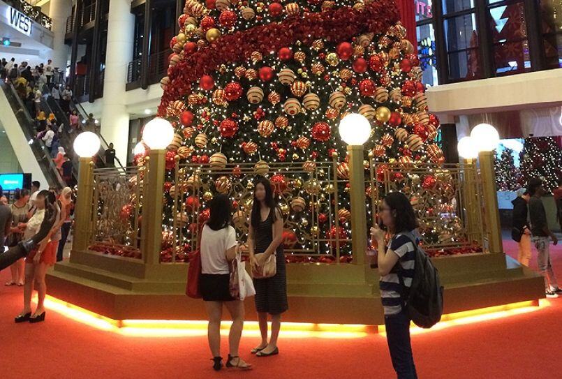 クリスマスツリーの周りは夏服の人々で大賑わい