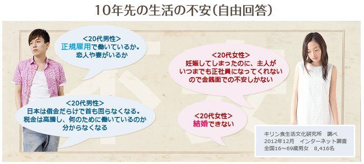 日本の経済成長期をほとんど知らない20代の若者。物心ついてからずっと経済停滞の中で生きてきた彼らが、今よりも明日がよくなるという手放しの期待をもつことができないとしても何ら不思議はありません。キリン食生活文化研究所が昨年末、将来への不安を自由回答で聞いたところ、20代からは結婚や就職、特に正規雇用されるかどうかなど、生活基盤に対する不安の声が多数挙がりました。