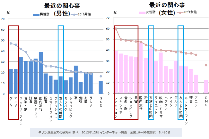 一方、20代男性の関心は「ゲーム」「アニメ」が二強で、「国内旅行」や「車」への関心は全体を下回っています。現実と向き合うよりも、ファンタジーの世界に逃避する傾向があるとするのは言いすぎでしょうか。また「友人との時間」は全体より高いものの3割を切っており、社会とのつながりは、外に出て直接とるというよりは、PCやテレビなどのメディア機器を通じて間接的にとりたい様子がうかがえます。ところで「お酒」への関心は男性全体と変わらず、関心という観点からは“若者の”酒離れとは言えないようです。
